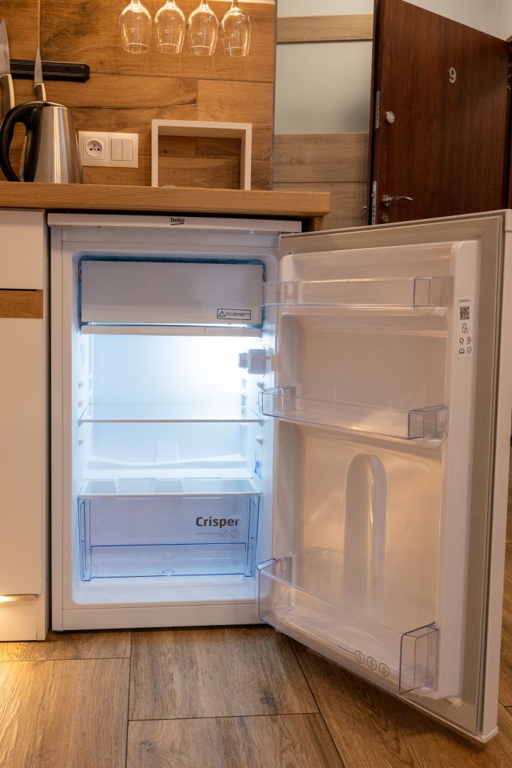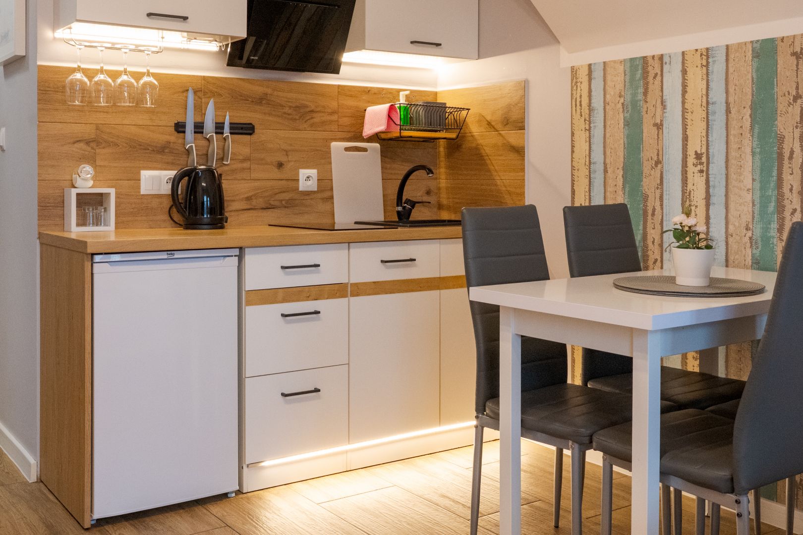 Apartament składający się z pokoju z łóżkiem małżeńskim (140 cm) oraz antresoli z dwoma łóżkami (90 cm), przeznaczony dla maksymalnie czterech osób.W skład apartamentu wchodzi łazienka z prysznicem oraz aneks kuchenny. Na wyposażeniu znajduje się telewizor Smart 32", ręczniki, naczynia i podstawowe sprzęty kuchenne. W sezonie grzewczym utrzymywana jest stała temperatura 22 stopnie.